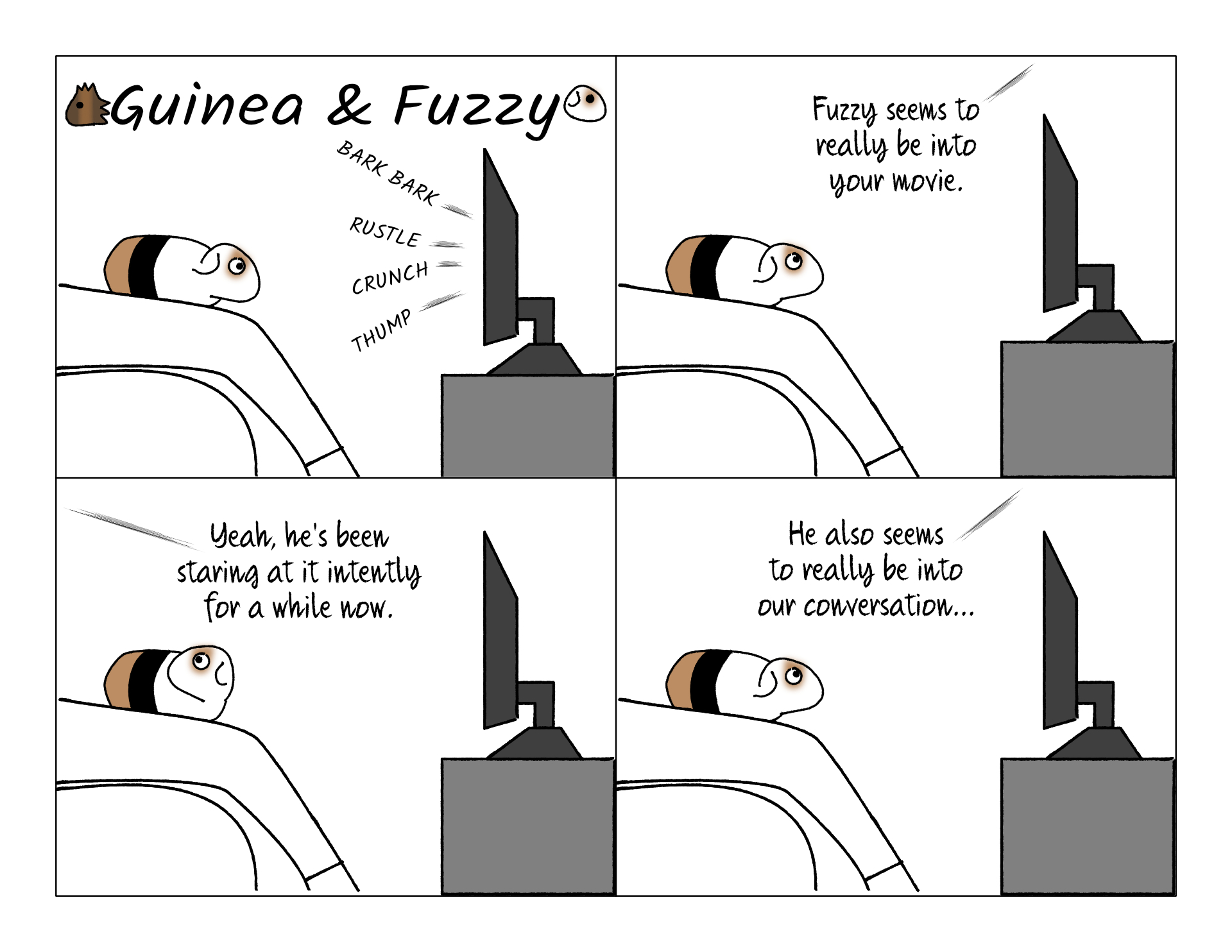 We recently discovered that Fuzzy loves movies! We used to watch movies with Guinea and Fuzzy when they were younger, and Fuzzy wasn't too into them. But for the last few years he couldn't sit with us for a long time because of his little bathroom problem. We finally got some small, super absorbent pads for him to sit on, so he can safely enjoy extended lap time. And when we watched a movie with him, he loved it! He'll lie down and stare at it intently while enjoying some ear scratches.