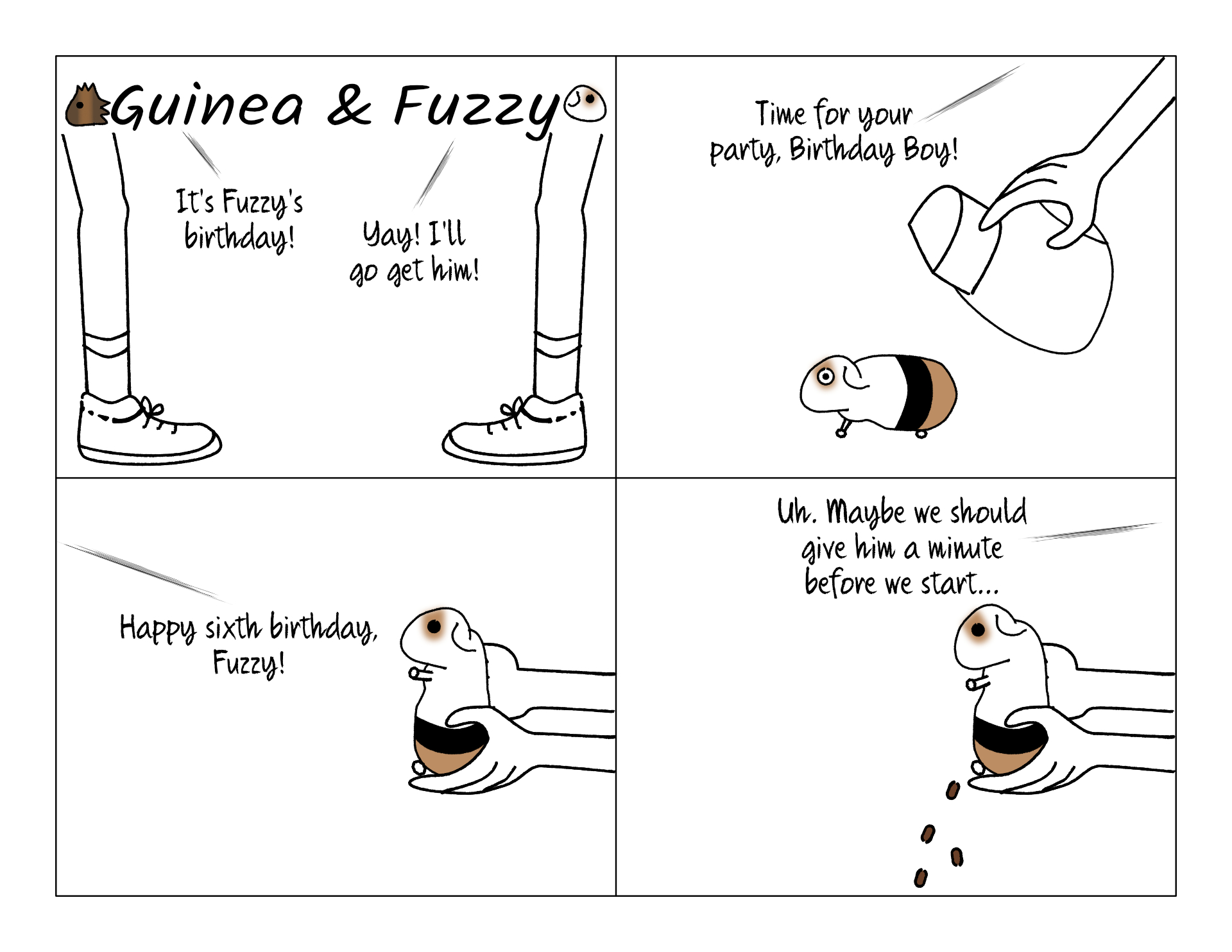 Poor Fuzzy. He doesn't get much time to prepare for his party. It's hard to tell him, "get ready for opening presents in five minutes" when he only really understands about 4 words. And most of them are food related.