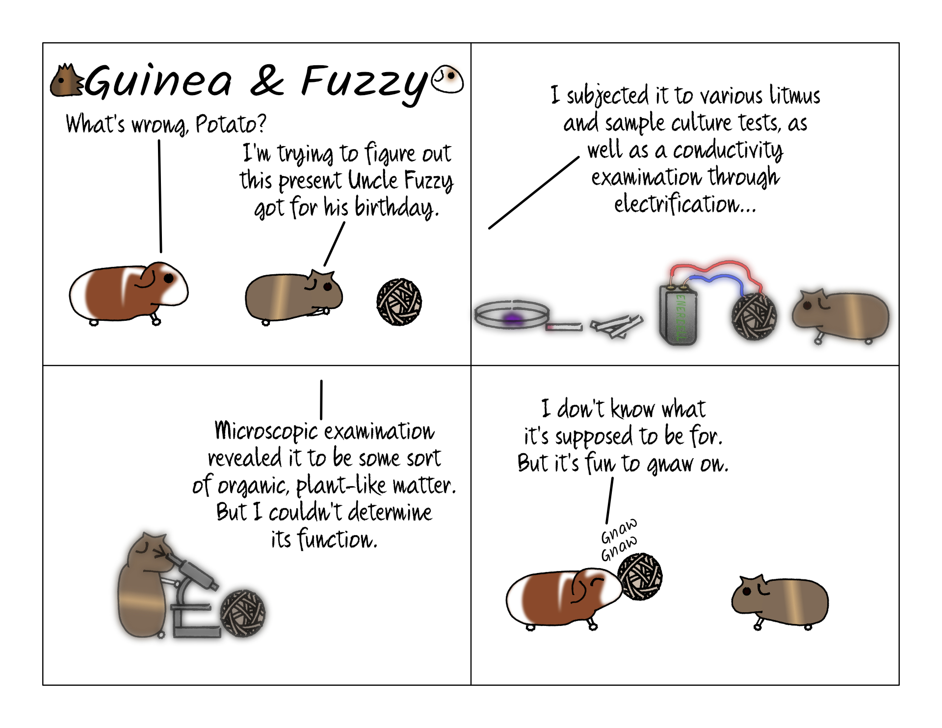 We got three chew toys for Fuzzy's birthday, and Potato wasn't really into them. The wicket ball reminded us of an art installation nearby that we call "the time machine" because it's a metal geodesic dome that looks all futuristic and is just big enough for one person to stand in. Maybe that's what Potato was hoping for.