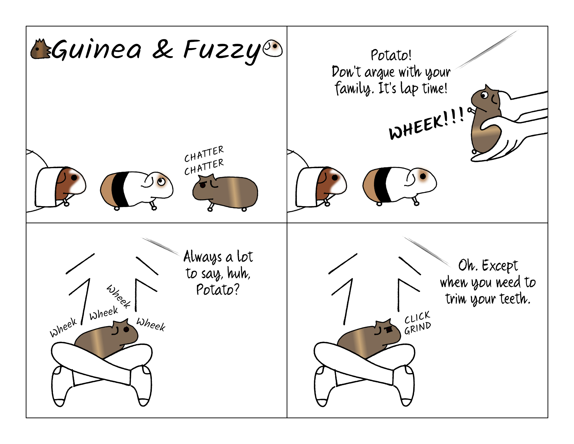 Of course Potato is famous for his ultra-loud squeals when he's being picked up. He enjoys lap time and doesn't struggle, so we assume he's just notifying the rest of the herd. And then when he's being held he quietly wheeks. He's definitely gossiping with us about the other pigs. It's a shame we can't understand, but we can guess what he's saying.