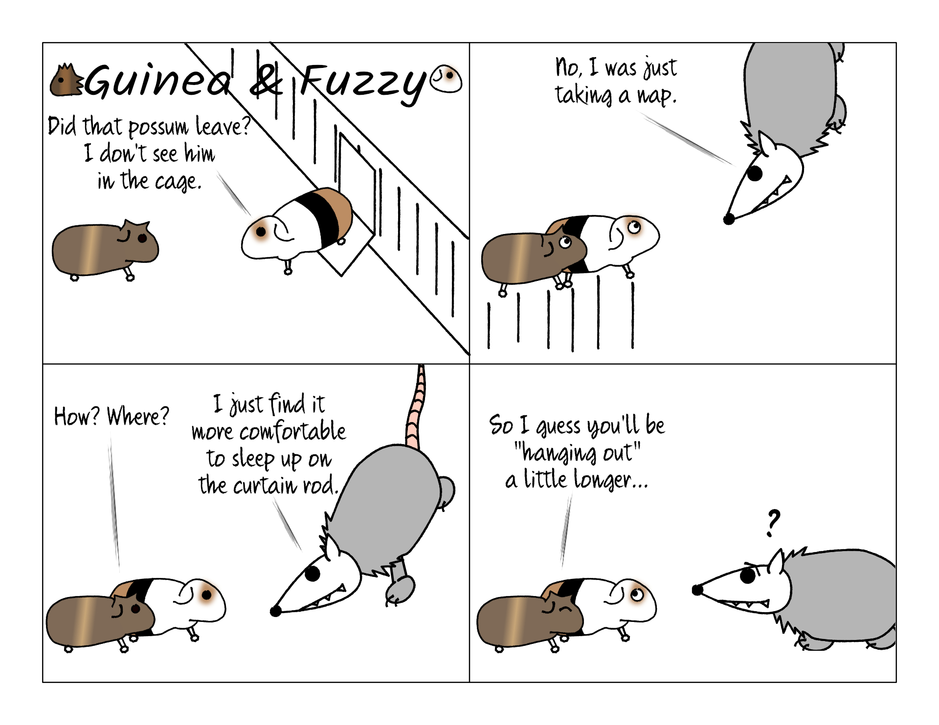 Ok, so, I cheated. An opossum might sleep on a curtain rod. But they wouldn't hang while they sleep. And in fact an adult possum can't even hang from it's tail alone at all. Potato can be forgiven for not knowing that.