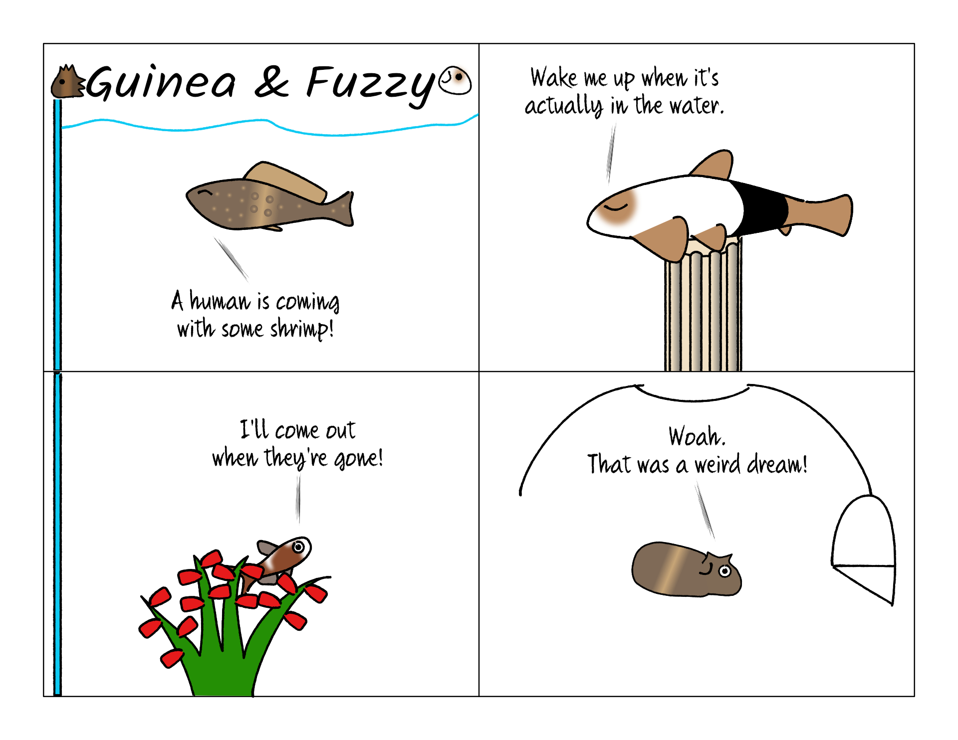 There are some parallels between our fish personalities and the pigs. One of the mollies here represents Potato. They are energetic and playful and don't mind hanging around in the open. They are also first to the surface of the water when we come with food. Captain Panda, our panda gara, plays the part of Fuzzy. She's stoic and bigger than the other fish, and likes to claim comfortable locations to sleep. Although she doesn't fight for food because she's a bottom feeder who scrapes biofilm off of the surfaces inside the tank, which is very different from Fuzzy. The tetras represent Bean. They are always hiding in the live plants, and we see them most often when they're forced to come out and eat. The barbs were still very new when this comic was drawn and we were still learning their personalities.