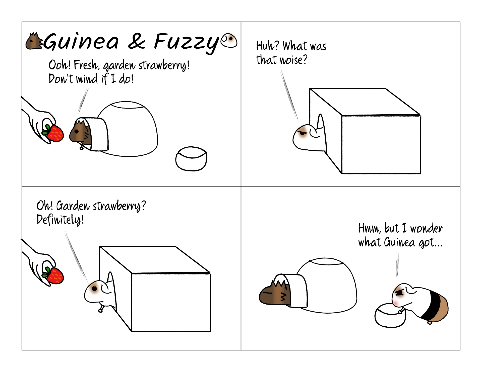 We often sneak food to just Guinea because Fuzzy is overweight. But we really laughed when we saw how suspicious Fuzzy was when he actually got an equal portion but didn't see it. He had to run over and check his bowl right away, hoping to get lucky.