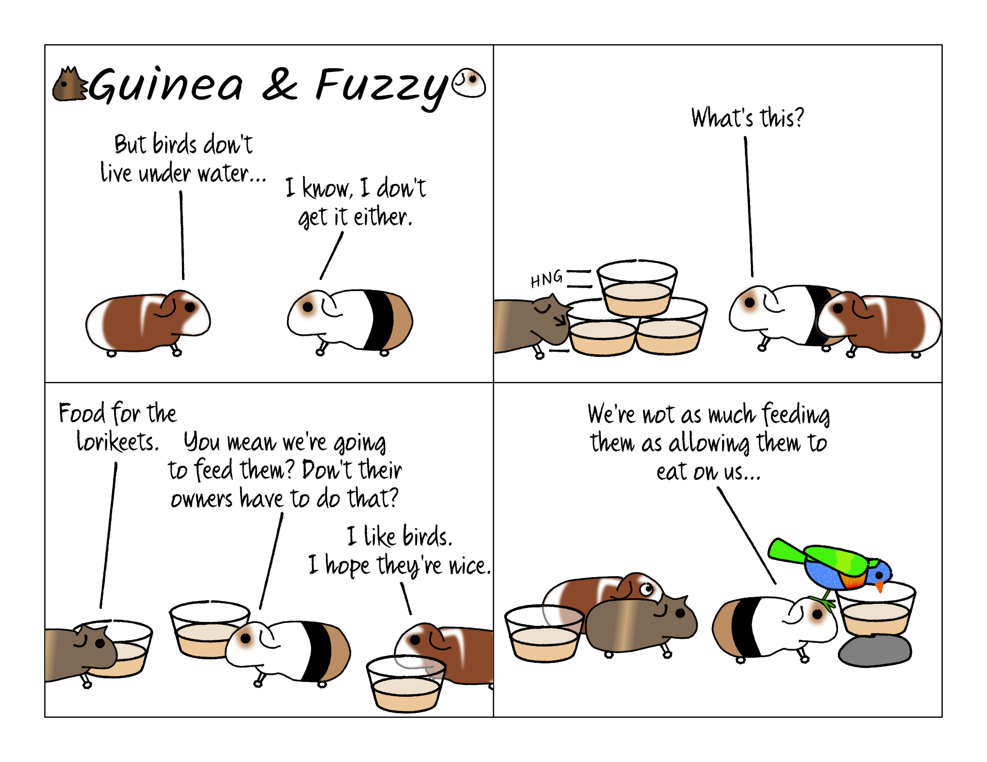I'm not sure why feeding lorikeets is an activity at so many zoos, aquariums, and aviaries, but we have them at our local aquarium as well. I always enjoy feeding the lorikeets, because they don't mind crawling on you and they are very cute. You just have to make sure you get there when they're hungry, but the aquarium helpfully puts up a sign to let you know how hungry they are.