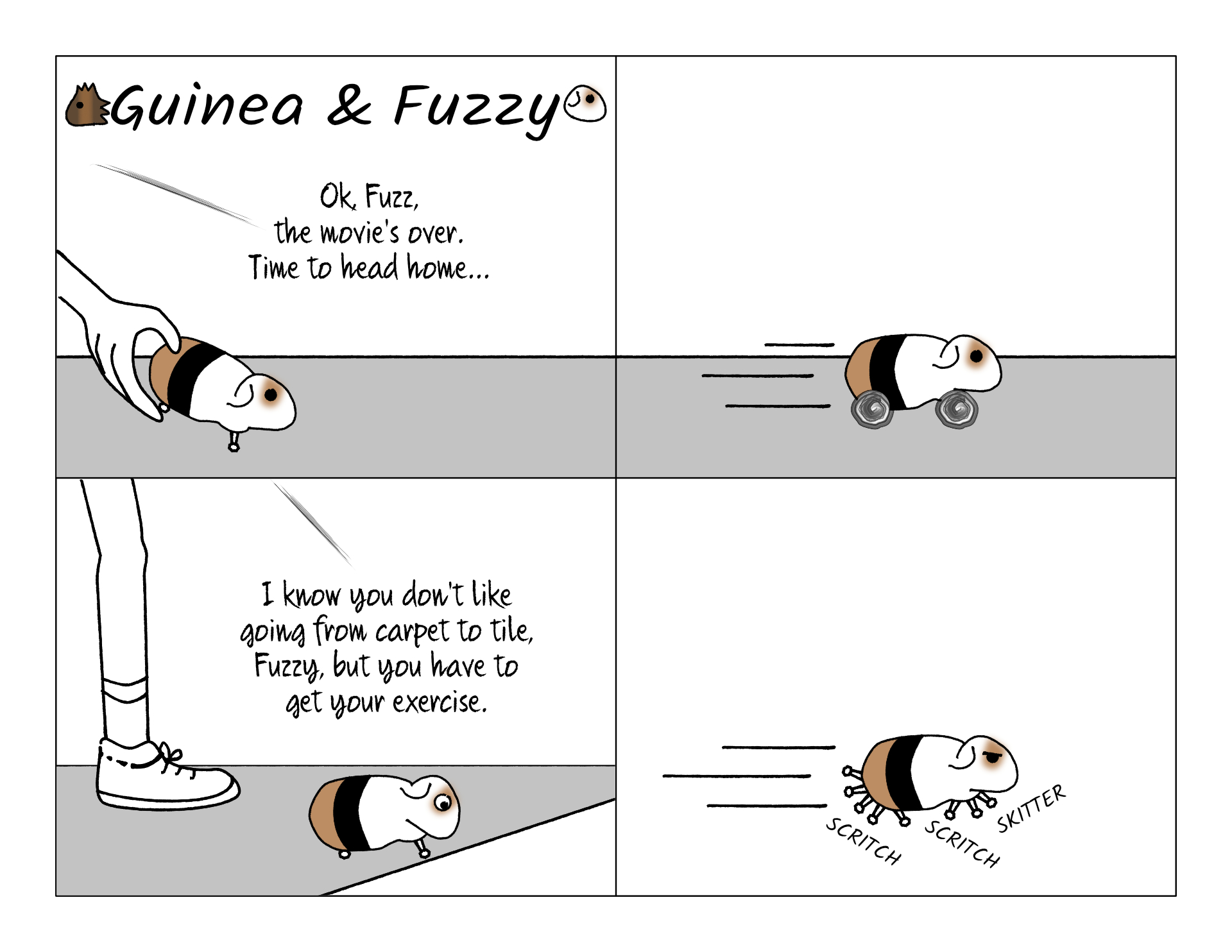 Whenever the pigs are done with lap time at the TV and it's time to run home, they always pause at the edge of the carpet. The hard tile is definitely less comfortable on their little claws.