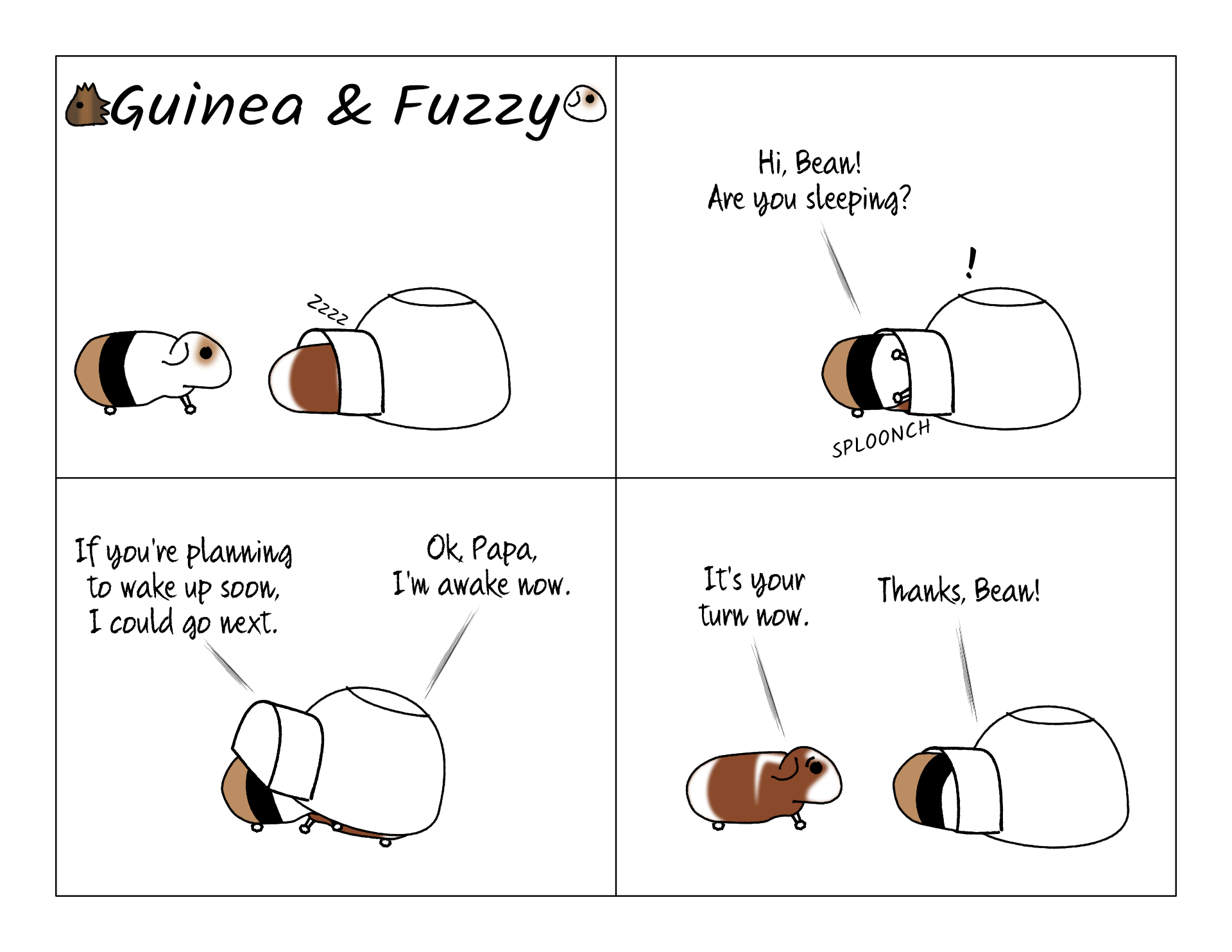 Bean and Fuzzy never really fight, but that doesn't mean they don't push each other around sometimes. Fuzzy always gets what he wants, and sometimes what he wants is Bean's pigloo.