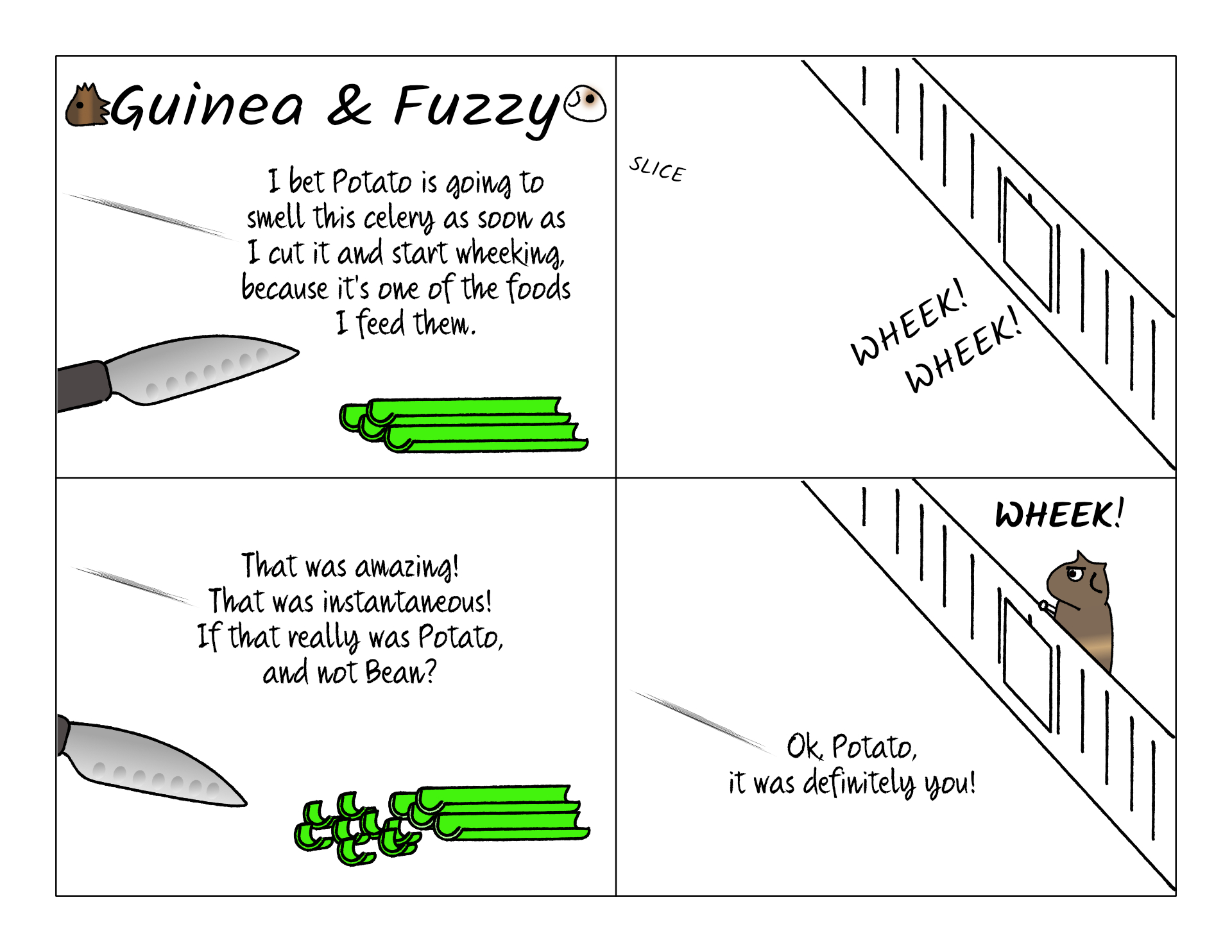 More proof that Potato is a genius pig. This really happened. Not only did he beg immediately after I said he would and sliced into the celery, he complained extra loud when I said it might be Bean.